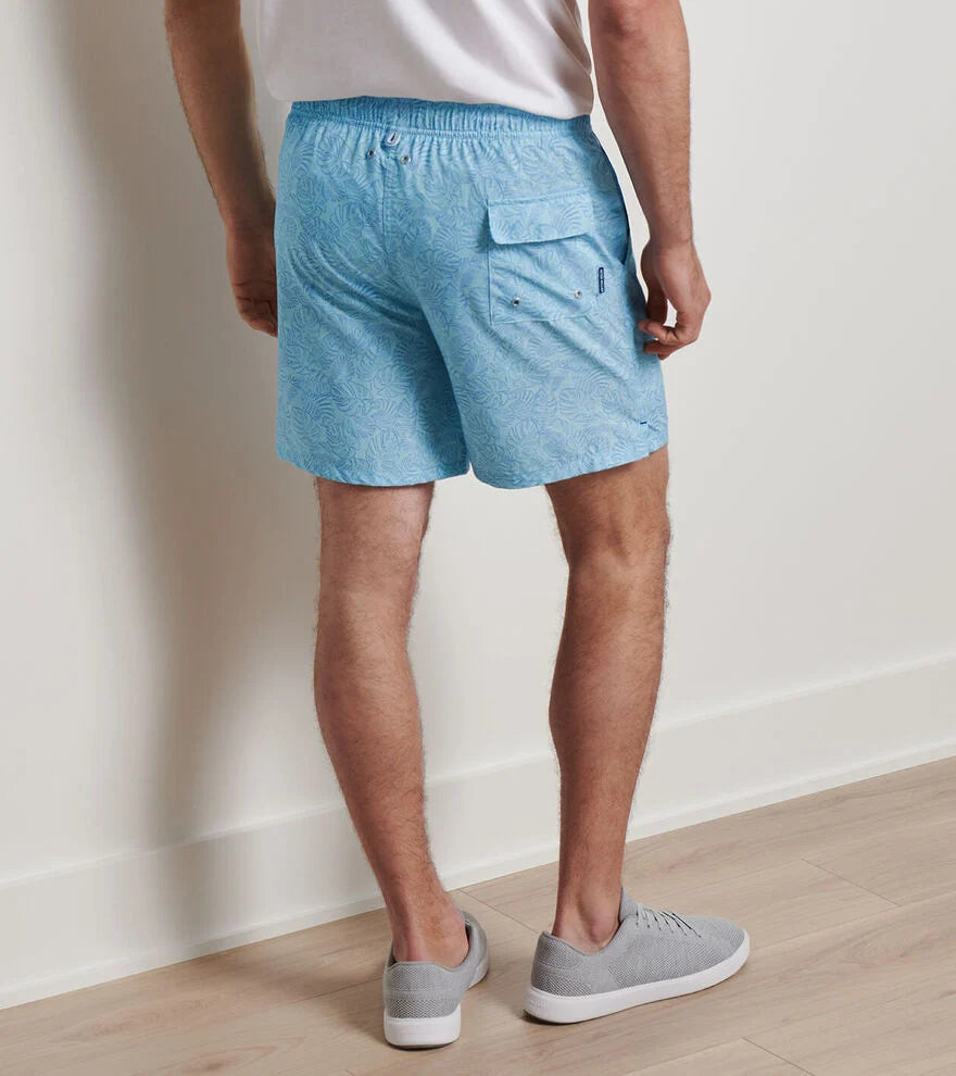 These swim trunks are a must-have for the beach or the pool. A four-way stretch fabric, fine mesh liner and tagless construction provide all-day comfort. They feature an exclusive hand-designed palm tree print made in our creative studio. Finished with a 7" inseam.