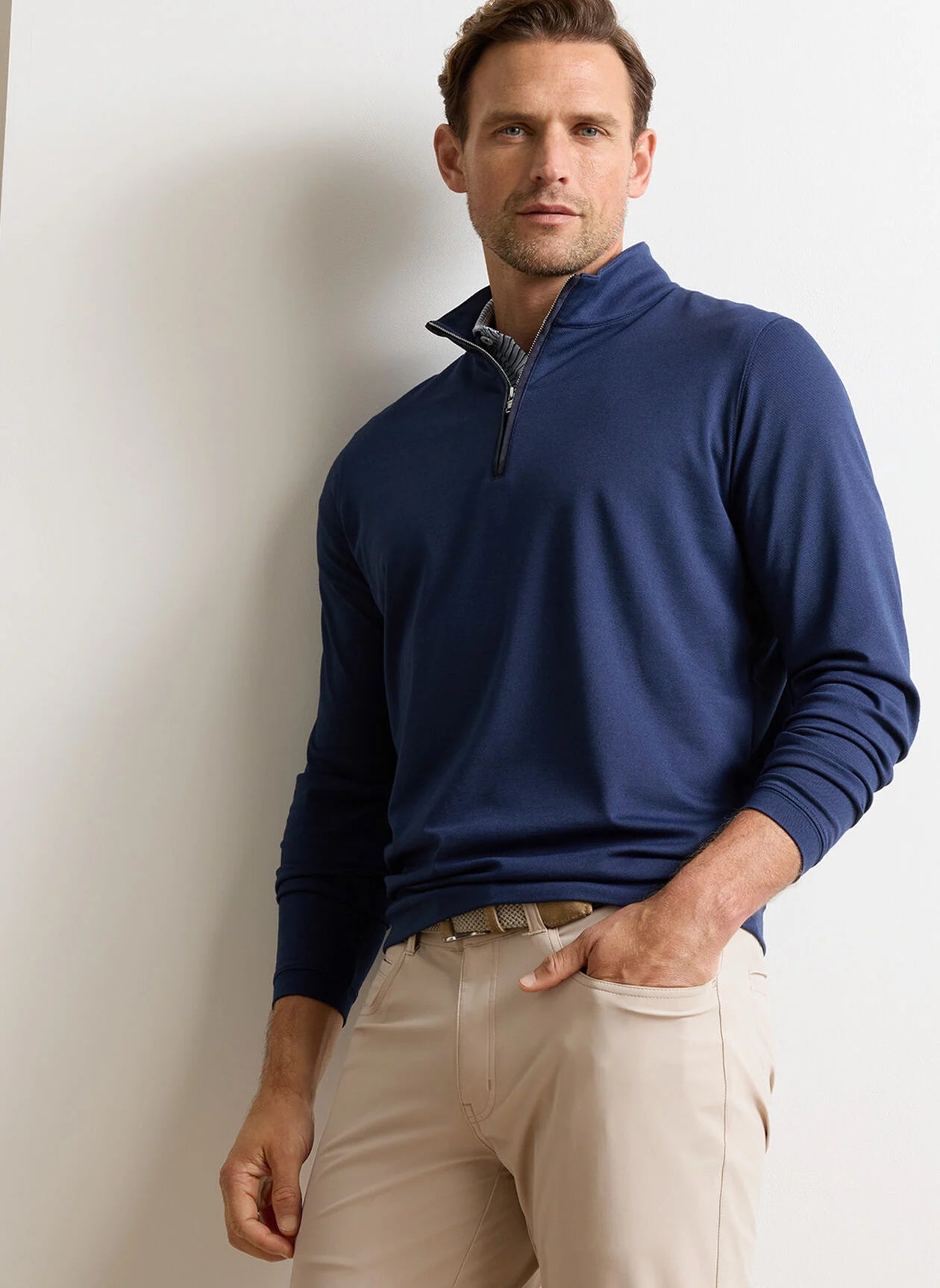 This lightweight quarter-zip styles like a sweater and plays like performance apparel for incredibly versatile wear. Leveraging a textured piqué fabric similar to our Albatross Polos, it offers a classic look, softness and stretch comfort. Finished with suede-like accents on the placket and interior collar.