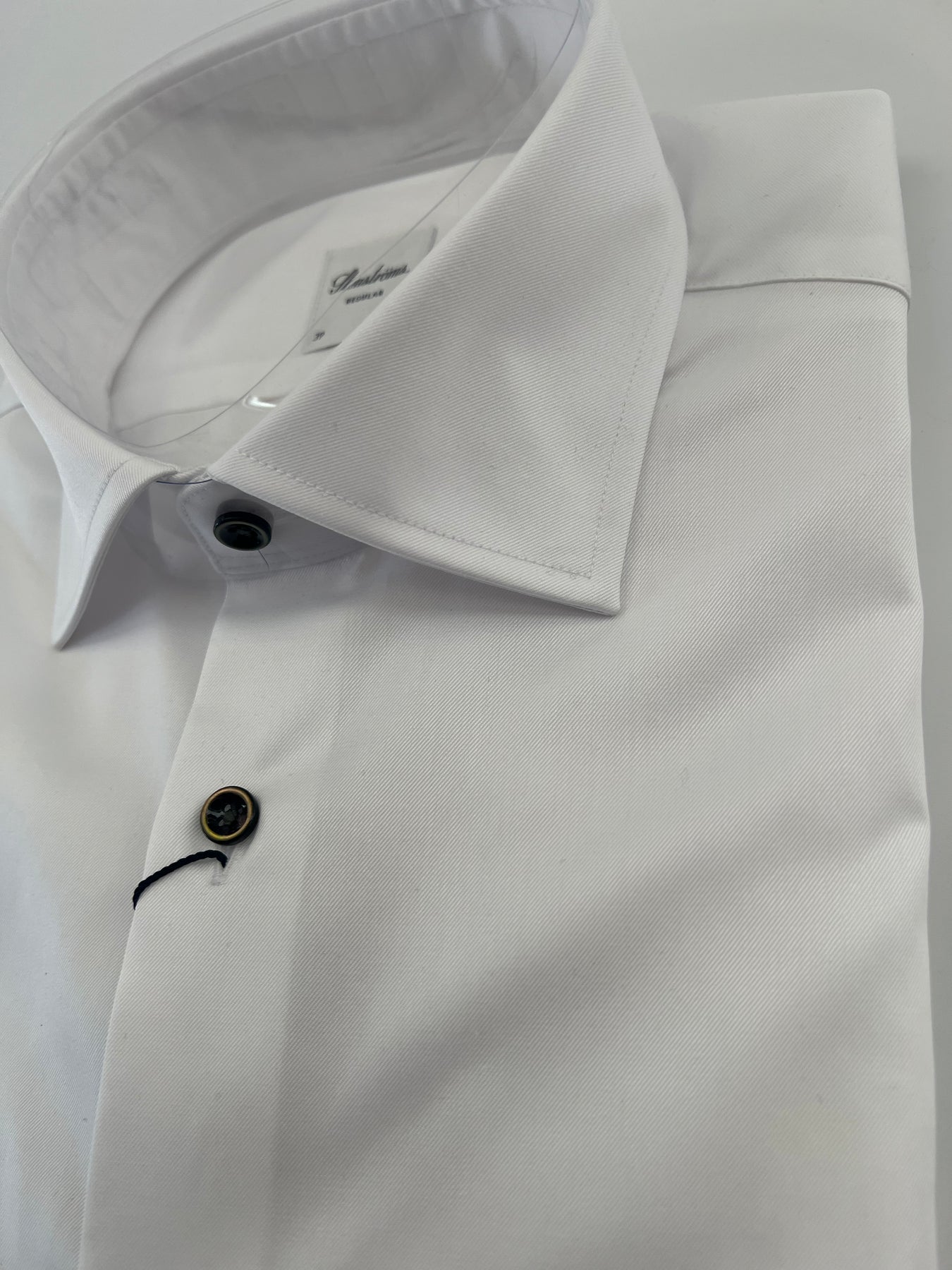 This twill shirt is made of twofold cotton. The shirt is detailed with mother of pearl buttons, single cuffs and a cut away collar.